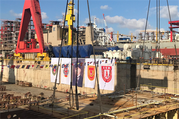 Türkiye'nin amiral gemisi olacak ilk yerli ve milli savaş uçak gemisi "Çok Maksatlı Amfibi Hücum Gemisi TCG Anadolu"nun birleştirilip havuza indirilen kısmı görüntülendi.